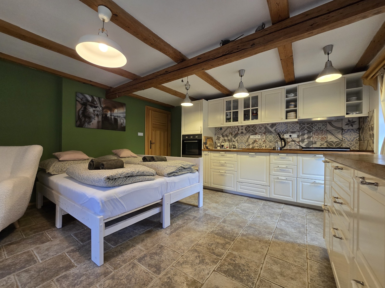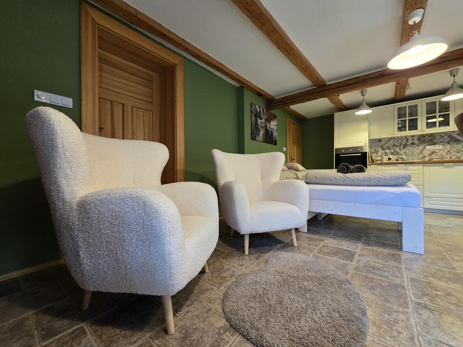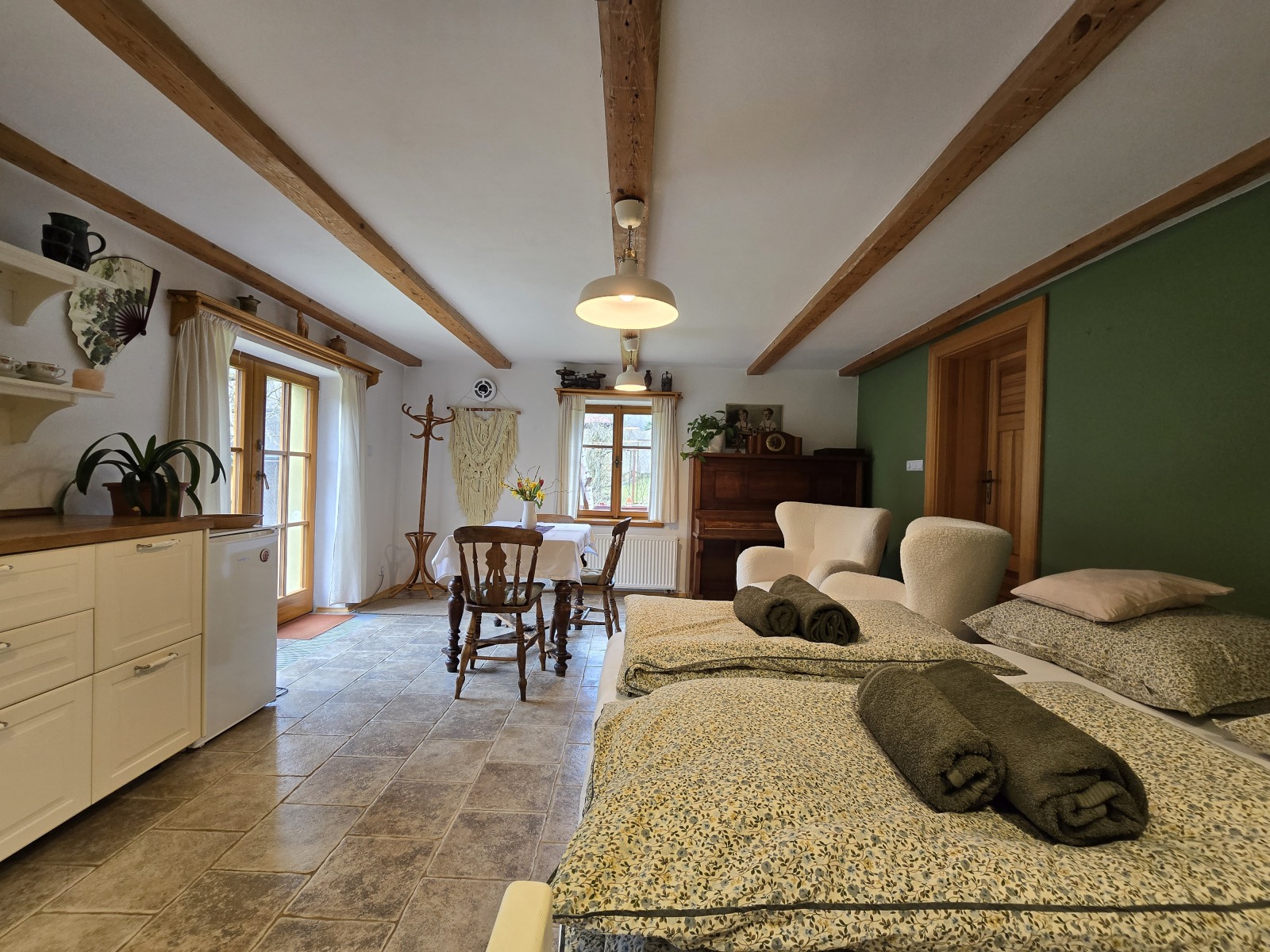 Tento apartmán se nachází v přízemí našeho domu, s vlastním vchodem a s přímým vstupem na zahradu. Občas nás v domě uslyšíte, což jsme vykompenzovali nižší cenou. Ideální volba pro ty, kteří nevyžadují absolutní ticho a zároveň hledají ekonomicky výhodné ubytování. Uvnitř vám bude k dispozici plně vybavená kuchyňská linka včetně myčky, indukčního dvouvařiče, trouby a ledničky. Samozřejmostí je jídelní set, dřevěná dvojlůžková postel nebo piano. Je zde vlastní koupelna se sprchovým koutem. I v tomto apartmánu je možné se po dohodě ubytovat také s vaším domácím mazlíčkem.