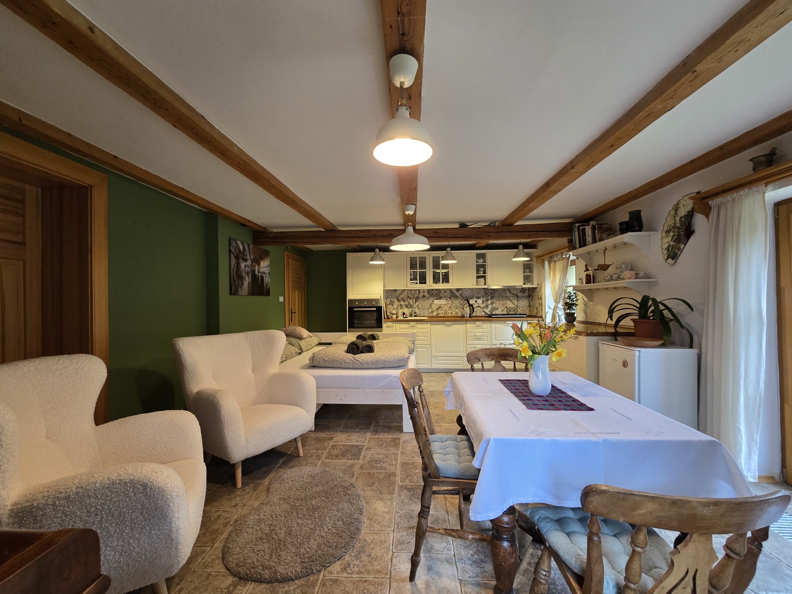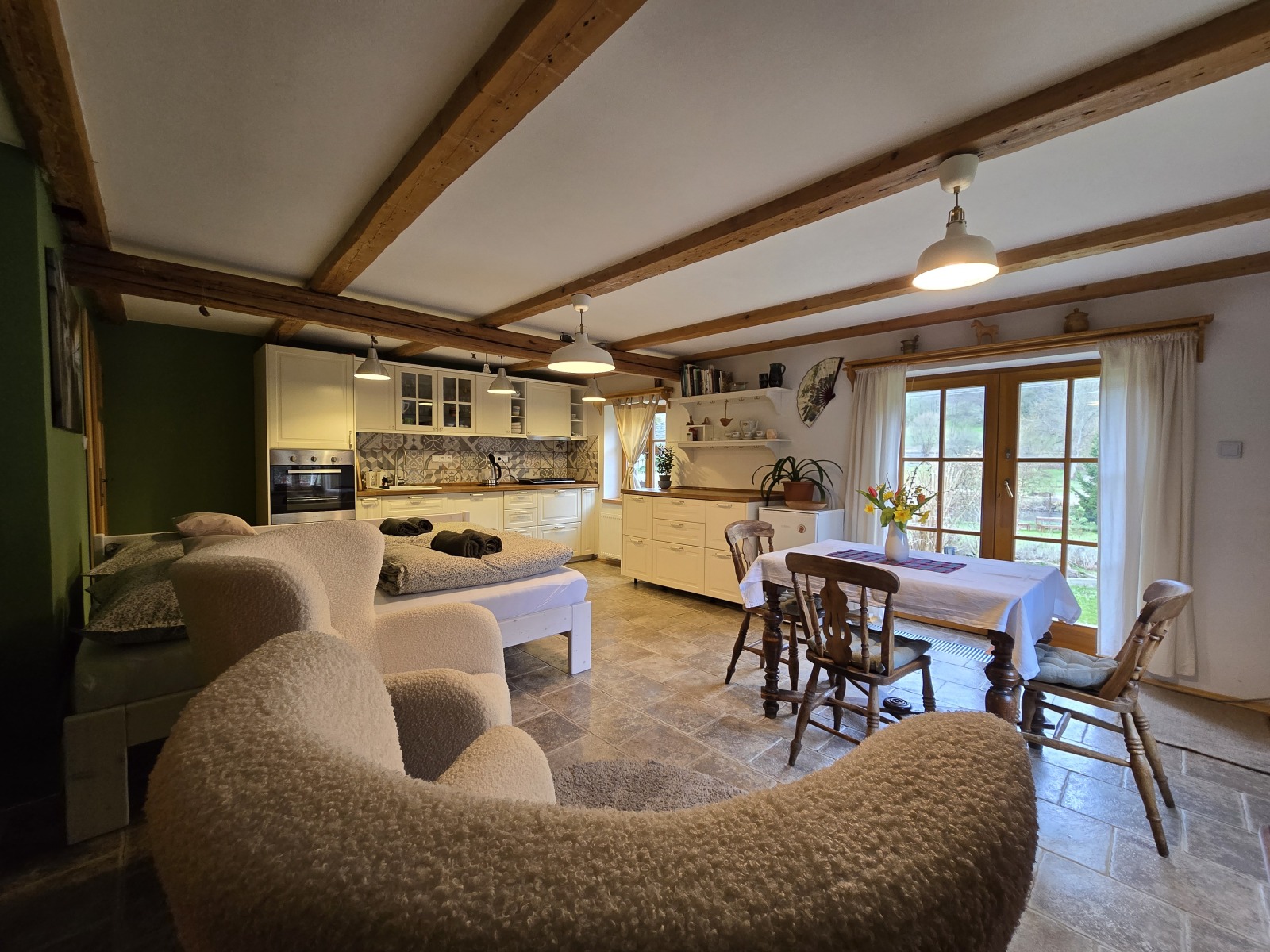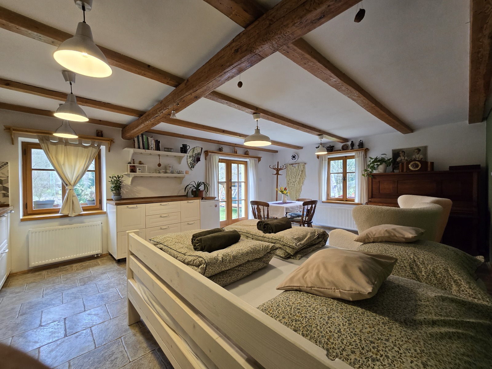 V ceně: Ložní prádlo, dva ručníky na osobu, jar, mýdlo, toaletní papír, houbičky na nádobí, úklidové prostředky, svíčky, a v sezoně bylinky z naší zahrádky.